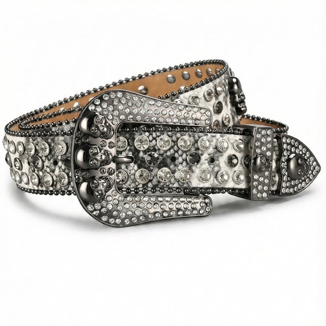 This Chrome hearts belt features a unique skull design embellished with rhinestones and made from high-quality snakeskin. Elevate any outfit with this statement piece, showcasing your edgy and stylish side.
