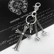 They feature different decorative metal pendants/charms such as dice, crosses, fleur-de-lis, daggers, and other gothic-style designs. They’re often made from stainless steel or alloy and are used both as practical key holders and as fashion accessories.