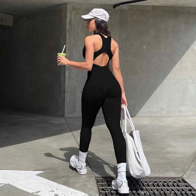 a fitted full-body jumpsuit with racerback cutout — the perfect blend of athleisure and street-ready energy.