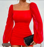 This is a red bodycon mini dress with a square neckline and long puffed sheer sleeves. It features ruched detailing on the body for a flattering fit.