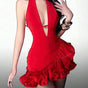 Deep V-neck halter mini dress with ruffle hem, often referred to in fashion catalogs as a sexy ruffle hem backless halter mini dress or "plunging neckline bodycon club dress.