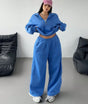 Casual oversized two-piece tracksuit featuring a quarter-zip pullover sweatshirt and wide-leg elastic waist sweatpants. It's a sporty loungewear look, great for street style or relaxed wear.