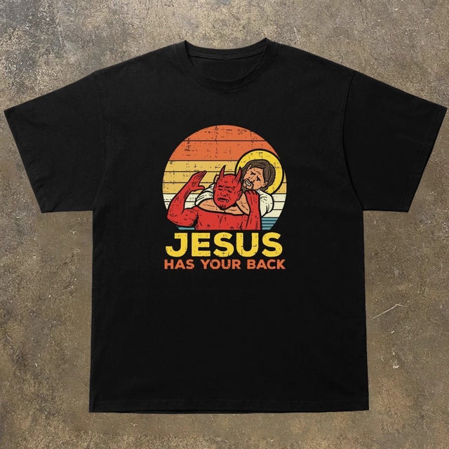 Make a statement with this Black “Jesus Has Your Back” Graphic T-Shirt, featuring a retro-inspired cartoon of Jesus holding back the devil. Designed with a bold slogan print and relaxed oversized fit, this tee mixes streetwear attitude with faith-inspired imagery.