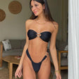 This is a stylish black two-piece bikini set. The top is strapless with a bandeau design and long wraparound straps that can be tied around the torso for a trendy, custom fit. The bottoms are high-cut with side ties, giving a flattering, adjustable fit. The overall look is sleek and minimal, perfect for a chic beach or pool day.
