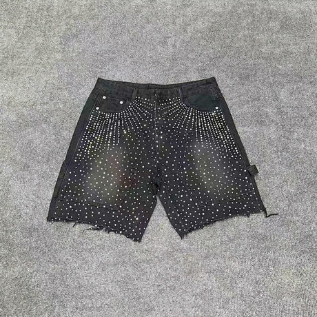 Black rhinestone-studded denim shorts.