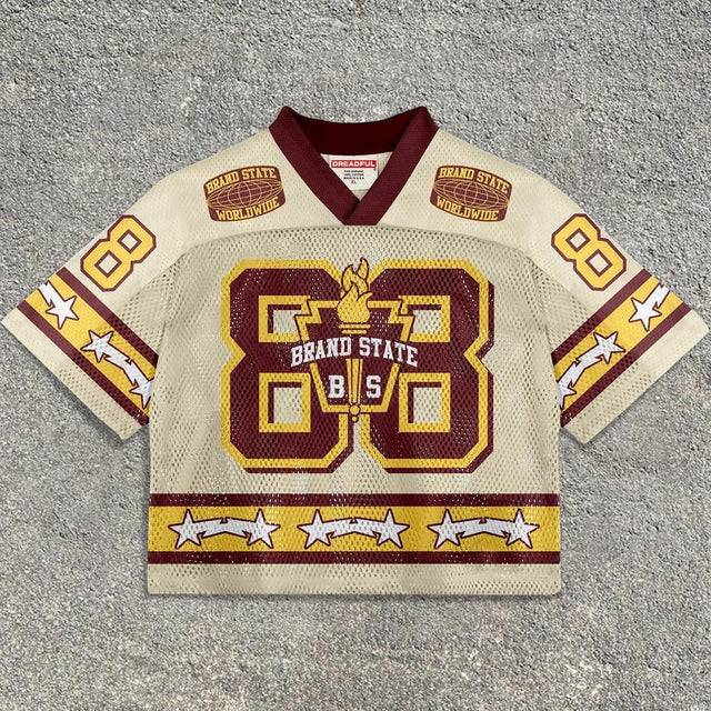This type of shirt takes inspiration from American football jerseys, but it’s been reworked for streetwear/fashion rather than athletic use. Brands often use bold graphics, oversized silhouettes, and mesh fabrics for this look.
