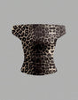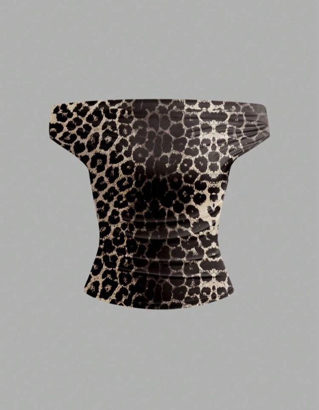 This is a leopard print bandeau top with a ruched, body-hugging design. The shape suggests it’s likely a strapless, off-shoulder crop top, ideal for styling with high-waisted pants, skirts, or matching printed pieces for a bold look.