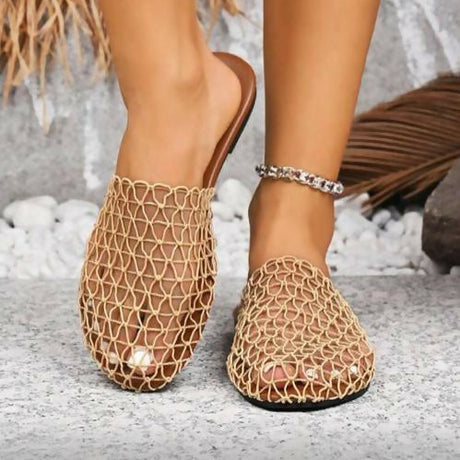 Beige CHANEL Raffia & Pearl Slide Sandals